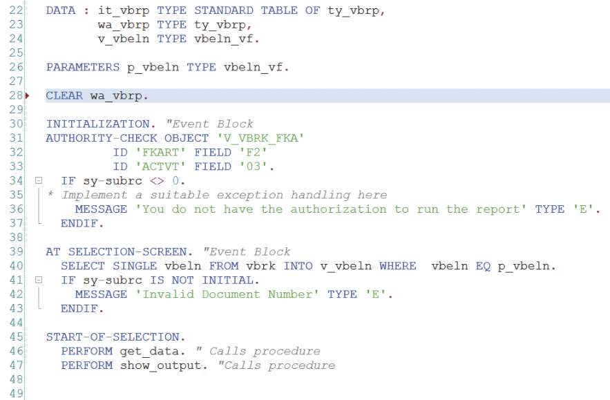 아래 예시를 보면, 28 번 째의 CLEAR 구문은 전역 데이터 선언 영역과 INITILIZIATION 사이에 존재합니다. 이러한 구문은 시스템에서 자동으로 START-OF-SELECTION 의 맨 상단에 추가하고 46번째 줄의 PERFORM get_data 문 이전에 실행할 것입니다.