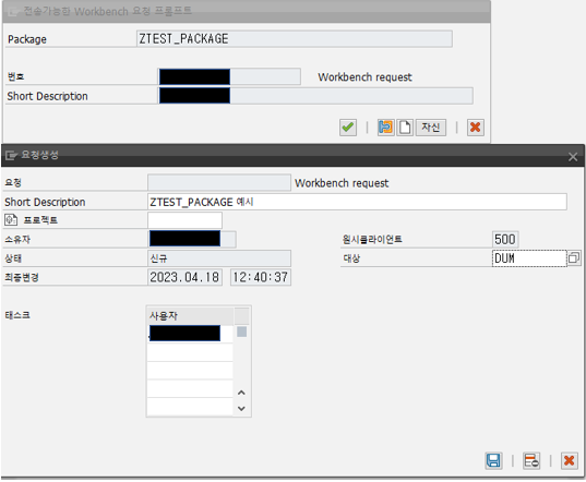 6. 생성이라면 저장버튼을 누르고 Dialog에 체크버튼을 누르면 Package가 생성되고 해당 Package가 방금만든 Transport Request에 할당된 것을 확인할 수 있습니다.