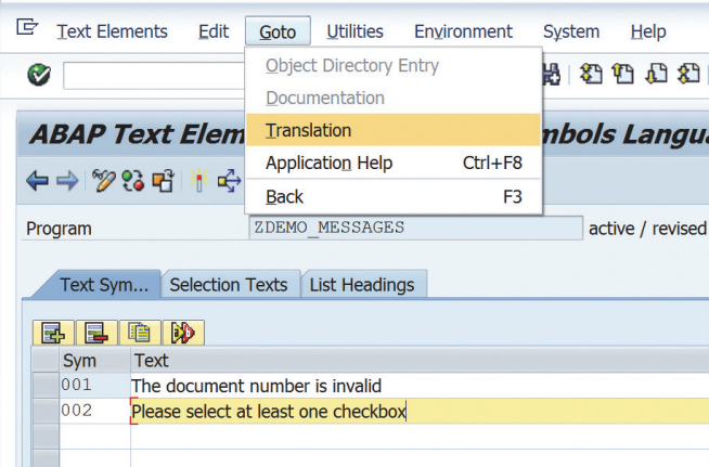 텍스트 심볼 편집기(text symbol editor)에는 "Change Text Symbols(텍스트 심볼 변경) 화면에서 Goto • Translation을 선택함으로써 각 텍스트에 대한 번역을 유지할 수 있는 옵션이 있습니다.