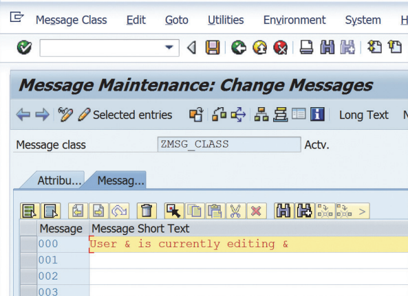 위 그림에서 동적 요소가 포함된 것을 알아차리셨을 수도 있습니다. 이 메시지는 사용자 이름과 프로그램 이름을 메시지 텍스트의 일부로 보여줍니다. 메시지 텍스트에서 ampersand(&)를 플레이스홀더로 사용할 수 있으며, 프로그램에서 MESSAGE 키워드의 WITH 추가를 통해 동적으로 대체할 수 있습니다. 메시지 텍스트에는 최대 네 개의 플레이스홀더를 사용할 수 있습니다.