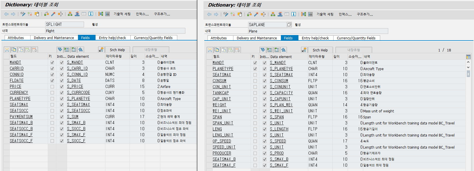 SFLIGHT 테이블의 PLANETYPE 필드는 SAPLANE 테이블에서 키 필드로 존재합니다. 여기서 SFLIGHT 테이블은 외래 키 테이블(foreign key table)이며, SAPLANE 테이블은 체크 테이블(check table)입니다.