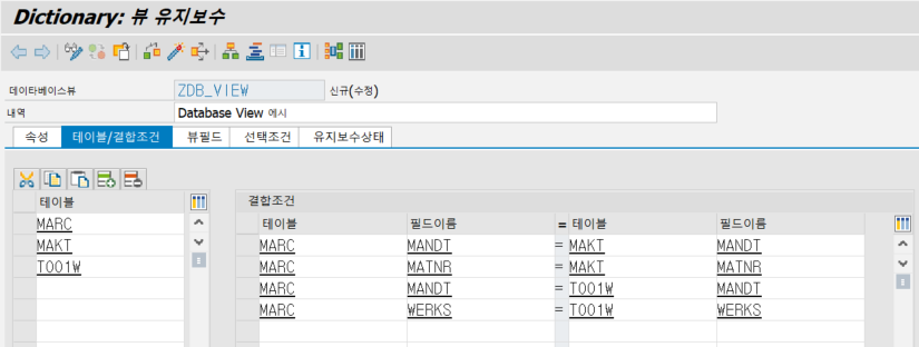 3. Table/Join Conditions 탭에서 조인하려는 데이터베이스 테이블의 이름을 테이블 열 아래에 입력하세요. 데이터베이스 뷰에서는 기본 테이블로 Transparent Table만 사용할 수 있습니다. 조인 조건 아래에는 테이블을 조인하는 조건을 입력하세요. 아래 그림에 표시된 대로 조인 조건에 MANDT 필드를 포함하여 데이터를 현재 클라이언트로 제한하세요. 오직 Inner 조인만 허용됩니다.
