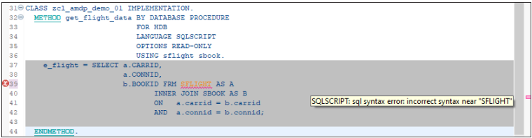 ADT에서는 SQLScript 구문 오류가 발생한 위치에서도 강조 표시할 수 있습니다. 아래 그림에 나와 있는 것처럼 구문 오류가 있는 SFLIGHT 문이 황갈색으로 강조됩니다. 또한 자세한 구문 오류 설명도 소스 코드 편집기 오른쪽에 볼 수 있습니다.