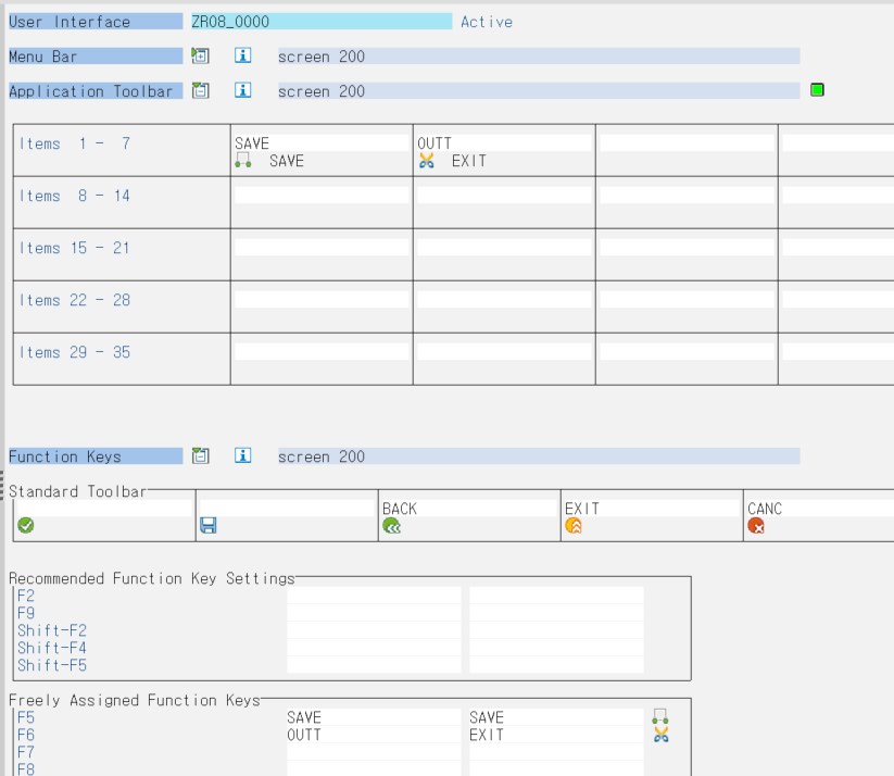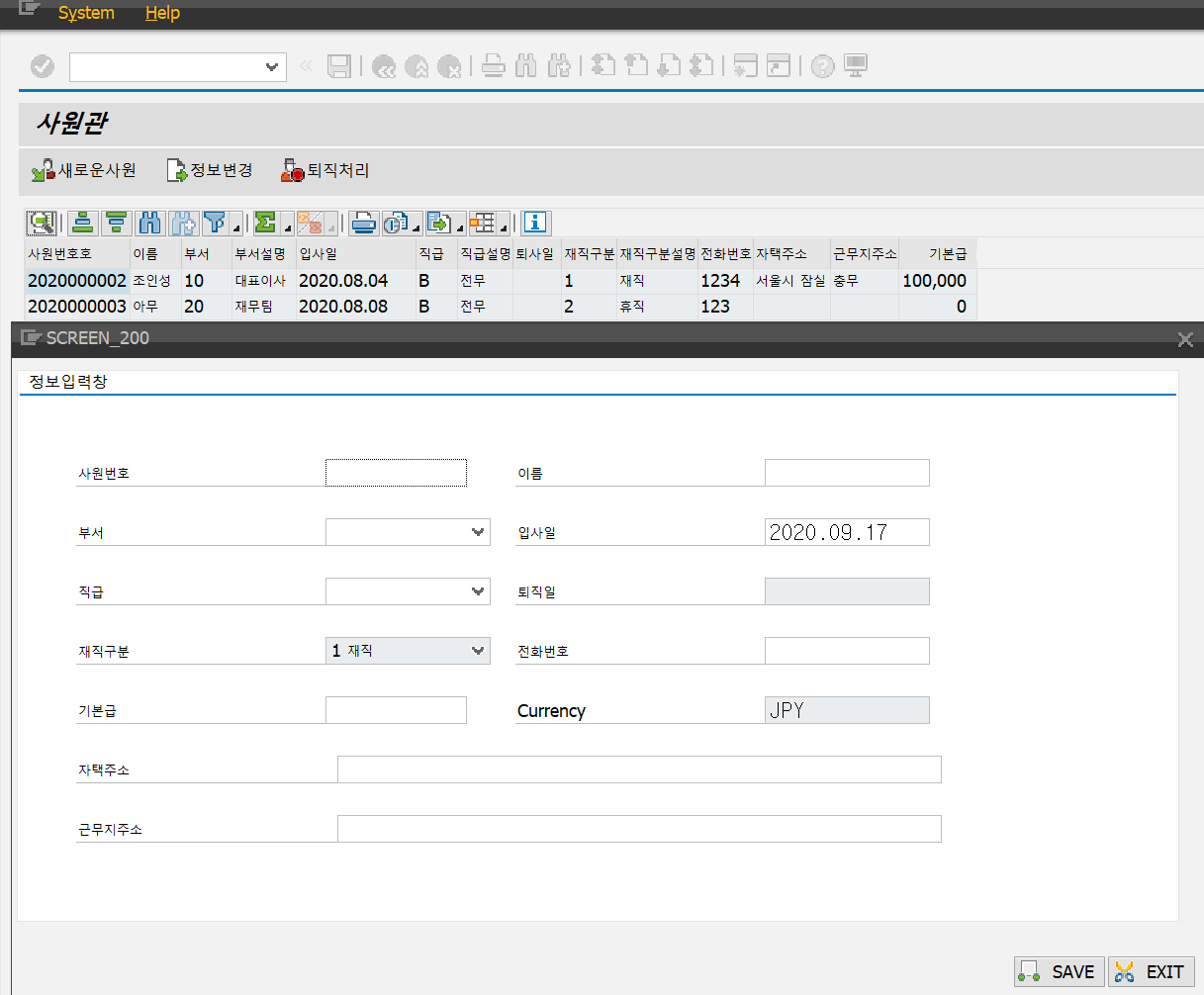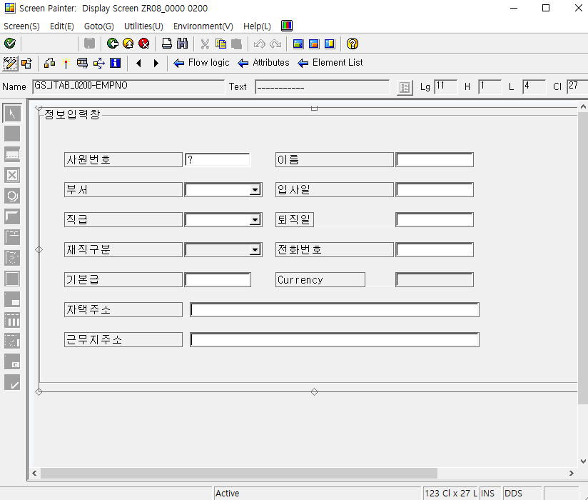 ▪스크린 100번에서 신규, 번경, 퇴직 버튼에 따라서 입력하는 버튼을 통해 스크린 200번을 불러 올 것. 그렇기 때문에 스크린 200번에는 위 그림과 같이 세팅을 해놓고 각각의 Input 창에는 TOP에서 선언한 200번 인터널 테이블의 필드에 맞게 Naming을 해주는 작업이 필요하다.