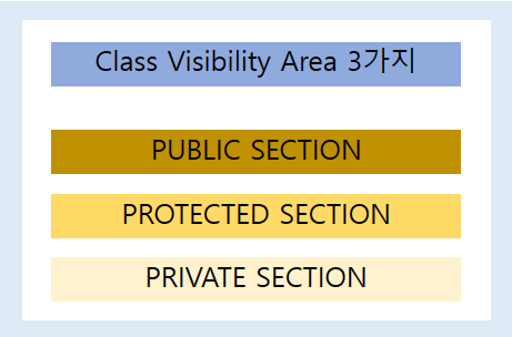 클래스의 구성요소들은 PUBLIC, PROTECTED, PRIVATE로 이루어진 visibility sections(특정 한국말로 정의할 수 있지를 못하겠음) 중 하나에 할당(선언)되는데 visibility sections은 각 구성요소에 누가 접근할 수 있는지를 결정합니다.