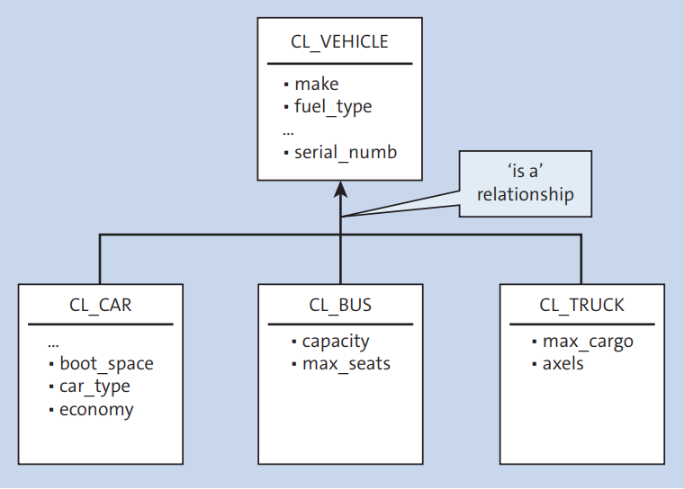 상속 관계는 개발자에게 클래스간의 유사성을 강조할 수 있게 해줍니다. 상의 클래스에서 실행가능했던 모든 특징들은 자동으로 하위 클래스에서도 가능합니다. 아래 그림을 보면( 이전 글에서 정의한 CL_VEHICLE을 기억하고 계셔야 합니다)