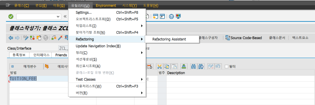 Refactoring Assistanct를 사용하기 위해서는, 클래스 Builder에서 Utilities -> Refactoring -> Refactoring Assistant를 아래 그림과 같이 들어가면 됩니다.